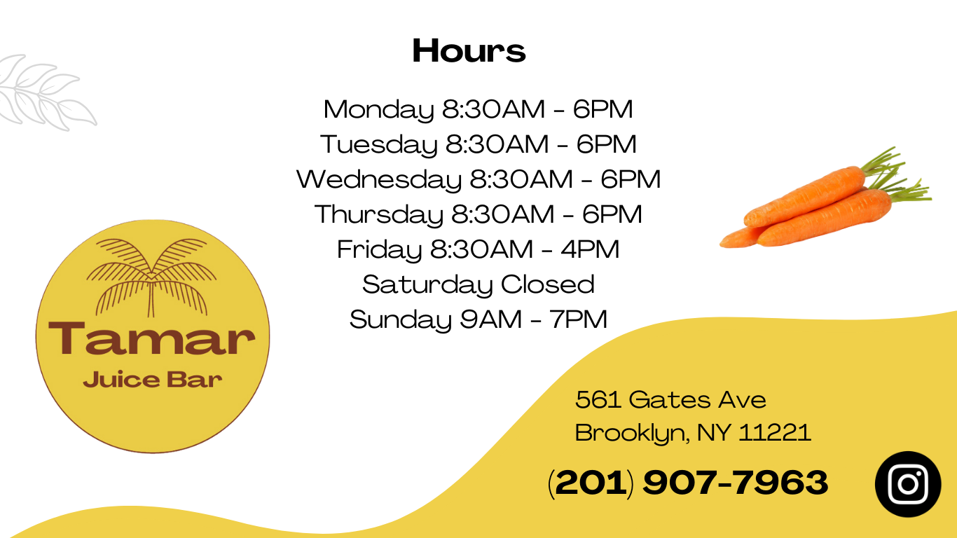 We are a juice bar located in the heart of Brooklyn, NY. With more than 9 years of experience in crafting delicious, nutritious, and refreshing drinks, Tamar Juice Bar is proud to be your go-to destination for healthy hydration.